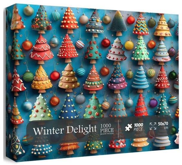 Csodás karácsonyfadíszek színes kavalkádja látható a Bboldin 1000 db-os puzzle - Winter Delight (Z-1244) képén. Merülj el a vidám részletekben és hangolódj az ünnepekre ezzel a szépséges kirakóval!