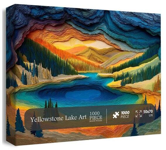 A Yellowstone-tó nyugodt szépsége kel életre a Bboldin 1000 db-os puzzle - Yellowstone Lake Art (PT-353) képén lenyűgöző, stilizált formában. A kékek, a zöldek és az aranyló naplemente kontrasztja különleges, álomszerű hangulatot kelt.