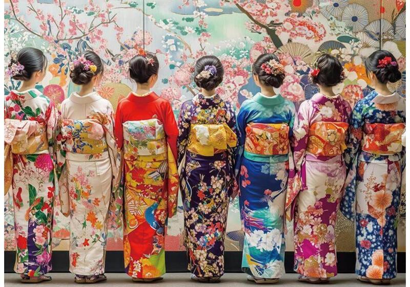 Hagyományos japán kimonót viselő gésák kelnek életre a Bboldin PT-403 - Elegant Kimono - 1000 db-os puzzle darabjain. Az élénk színek és minták igazán izgalmas vizuális élményt nyújtanak.