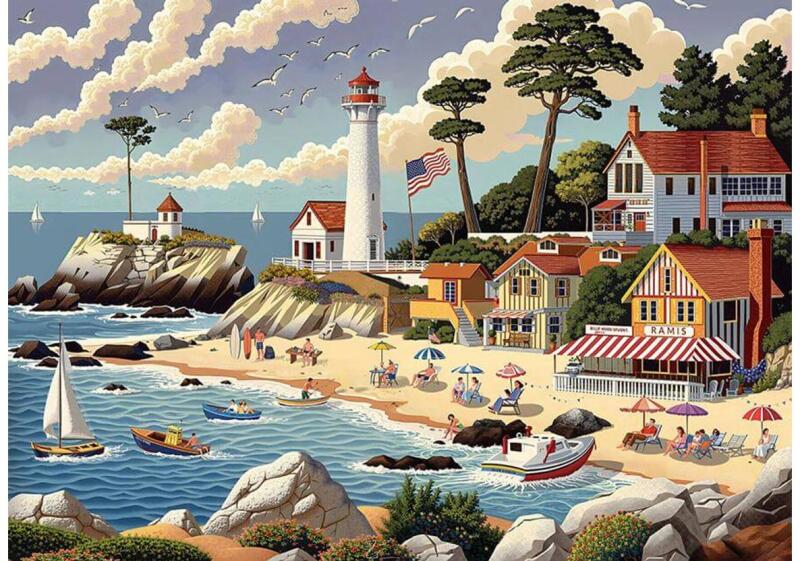 Napos tengerparti táj, retró hangulatban. A Bboldin PT-8 - Sunshine Coast - 1000 db-os puzzle darabjai nyugodt, pihentető élményt adnak.