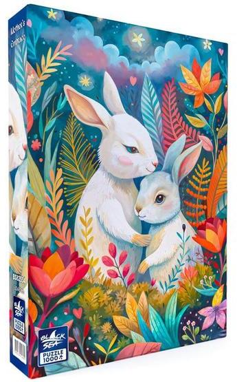 Egy anya nyuszi és a kicsinye jelenik meg a Black Sea 1000 db-os puzzle - Mother's Embrace (BS82534) melegséggel teli jelenetében. A kép a gondoskodás és az érzelmi biztonság kifejezése.
