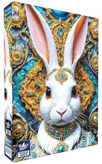 Egy gyönyörű fehér nyúl elevenedik meg a Black Sea 500 db-os puzzle - Precious creatures - Rabbit (BS82507) képén mesés ékszerekkel körülvéve. Az arany és türkiz kompozíció egyszerre modern és klasszikus.