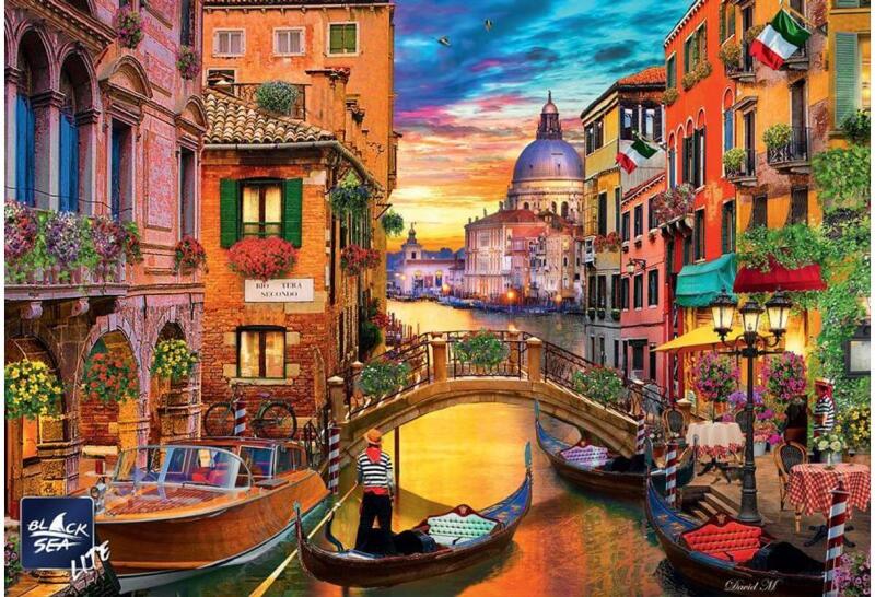 Velence híres csatornája és romantikus épületei tárulnak elénk naplementében fürödve. A festői város minden részlete életre kel a Black Sea BS82113 - Grand Canal Venice - 1000 db-os kirakón .