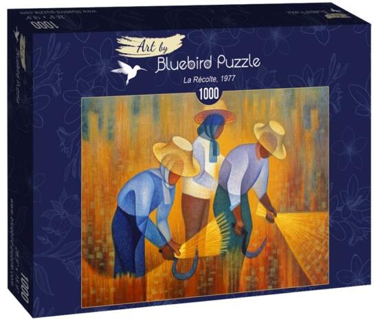 Az 1000 db-os Bluebird Art by puzzle képén a francia művész jellegzetesen arctalan emberekkel ábrázol egy aratást.