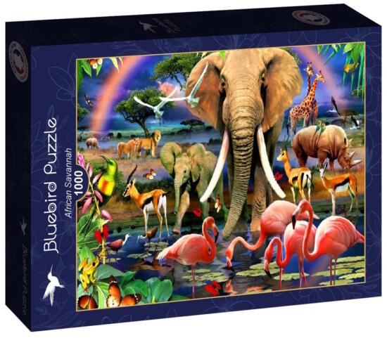 Bluebird 1000 db-os puzzle - African Savannah  című képén a szavannai élővilág jellegzetes képviselői láthatók, Robinson Howard brit művész alkotásában.