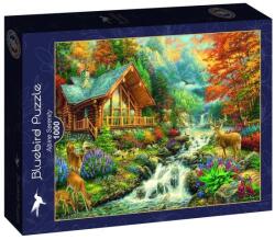 Bluebird 1000 db-os puzzle - Alpine Serenity  című képén egy idilli, alpesi kunyhó látható patakkal, őzikékkel, szarvassal és vadludakkal a környezetében, Chuck Pinson amerikai festőművész alkotásában.