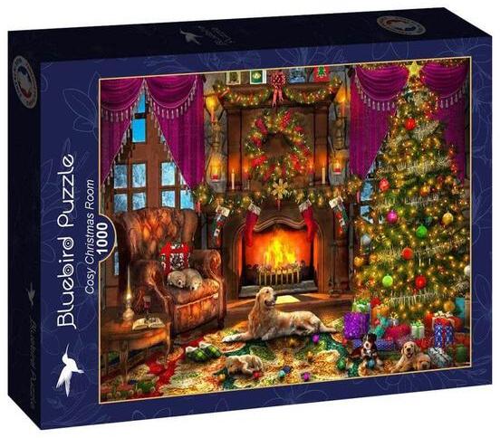 A francia  Bluebird  2019 óta van jelen a kirakók világpiacán. Magas minőségű, környezettudatos technológiával készült, mégis megfizethető áron elérhető puzzle képei közt elsősorban művészi alkotások találhatók. Az 1000 db-os Bluebird puzzle - Cosy Christmas Room  című képén békés karácsonyi hangulat elevenedik meg. A szobában egy gyönyörű karácsonyfa, ajándékok, egy kandalló és egy aranyos golden retriever a tündéri kiskutyáival.