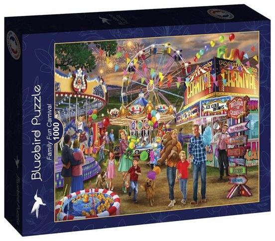 A francia  Bluebird  2019 óta van jelen a kirakók világpiacán. Magas minőségű, környezettudatos technológiával készült, mégis megfizethető áron elérhető puzzle képei közt elsősorban művészi alkotások találhatók. Az 1000 db-os Bluebird puzzle - Family Fun Carnival  című képén egy vidámpark vattacukor illatú forgatagában találhatjuk magunkat. Óriáskerék, körhinta, lufi, nyalóka, vidám gyerekek és kutyák. Mi kell még a boldogsághoz?