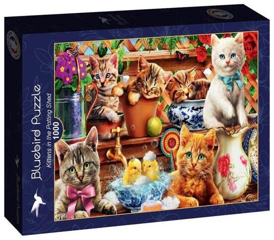 A francia  Bluebird  2019 óta van jelen a kirakók világpiacán. Magas minőségű, környezettudatos technológiával készült, mégis megfizethető áron elérhető puzzle képei közt elsősorban művészi alkotások találhatók. Az 1000 db-os Bluebird puzzle - Kittens in the Potting Shed  című képén cuki cicákat és csirbéket láthatunk virágcserepek között. .