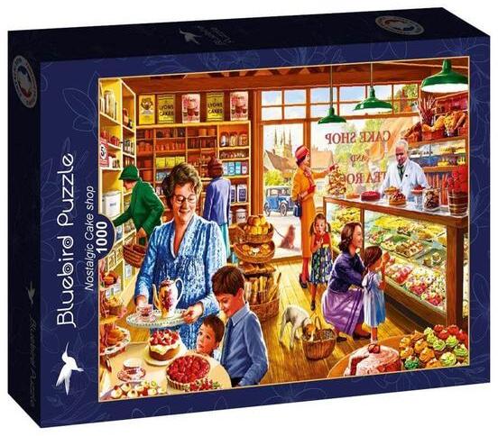 A francia  Bluebird  2019 óta van jelen a kirakók világpiacán. Magas minőségű, környezettudatos technológiával készült, mégis megfizethető áron elérhető puzzle képei közt elsősorban művészi alkotások találhatók. Az 1000 db-os Bluebird puzzle - Nostalgic Cake shop  című képén egy nosztalgikus hangulatú cukrászda mindennapjaiba kapunk betekintést. Szebbnél szebb sütemények és édességek csábítanak a bűnbeesésre.