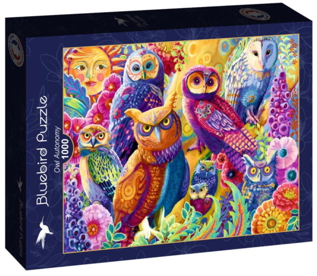 A Bluebird 1000 db-os puzzle - Owl Autonomyl  című képen, nagyon szép színes baglyok láthatóak.