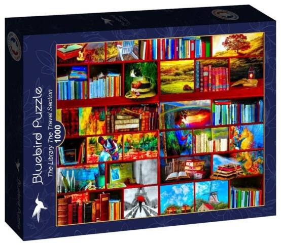Bluebird 1000 db-os puzzle - The Library The Travel Section  című képének segítségével egy könyvtár utazási részlegén találjuk magunkat, izgalmas útikalauzok között.