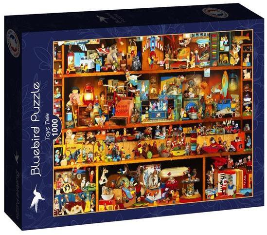 Bluebird 1000 db-os puzzle - Toys Tale  című képén egy óriási polcnyi játék mesél különleges történeteket. A mesékben szerepelnek mackók, katonák, baseball játékos majmok, tornyok, búgócsigák és westernhősök is.