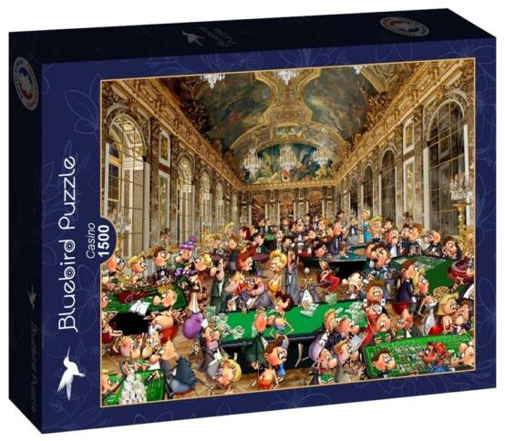 Bluebird 1500 db-os puzzle - Casino  című képe egy cseppet sem szokványos játékterembe repíti a kihívásokat kedvelőket. Ebben a hatalmas, díszes kaszinó ban megtalálható tenyérjós , kártyavár építő verseny , de még vetkőzős póker is! Játékra, kalandra fel!