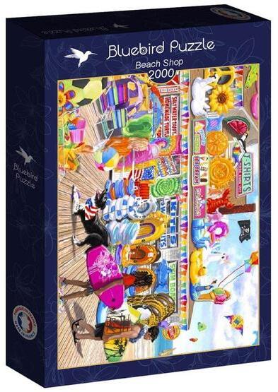 A francia  Bluebird  2019 óta van jelen a kirakók világpiacán. Magas minőségű, környezettudatos technológiával készült, mégis megfizethető áron elérhető puzzle képei közt elsősorban művészi alkotások találhatók. A 2000 db-os Bluebird puzzle - Beach Shop  című képén egy tengerparti bazár élénk forgatagában találjuk magunkat gumimatracok, úszógumik, strandlabdák és vidám gyerekek között.