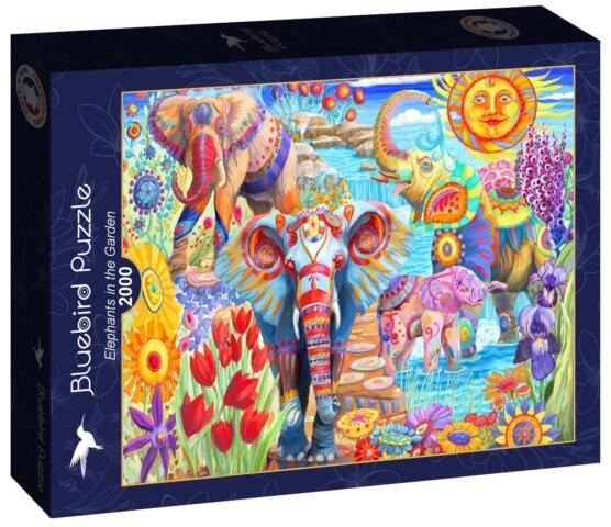Bluebird 2000 db-os puzzle - Elephants in the Garden puzzle  képén színes elefántokat láthatunk a kertben.