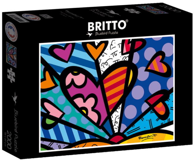 2000 db-os Bluebird - Romero Britto - Sunset puzzle  képén a brazil művész illusztrációjában szívekkel megszínesített naplemente jelenik meg.