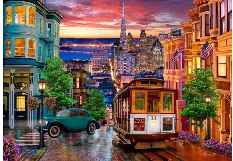 2000 db-os Bluebird - San Francisco Trolley puzzle képén  David Maclean egyik csodálatos alkotása, a híres kábelvasút látható. Ez a világ utolsó, még működő kábelvontatású, városi tömegközlekedési eszköze.