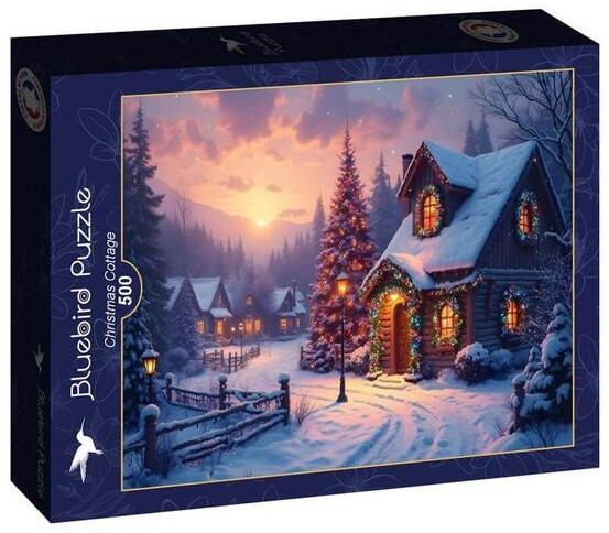 A bájos kis házikó fényei melegen hívogatnak a havas erdő szélén. A Bluebird 500 db-os puzzle - Christmas Cottage (91076) képét a karácsony csendes varázsa járja át.