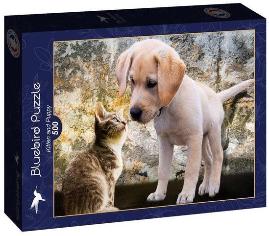 Bluebird 500 db-os puzzle - Kitten and Puppy  című képen cuki kiskutya és kiscica ismerkedését láthatjuk. A kirakó cáfolja azt a tényt, mely szerint a kutyák és a macskák örök ellenségek.