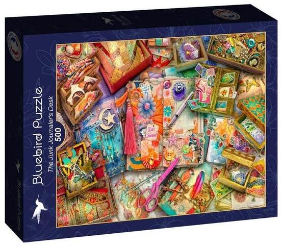 Merülj el a színek és formák sokaságában a Bluebird 500 db-os puzzle - The Junk Journaler's Desk  kirakóval! A képen szebbnél szebb naplókat láthatunk, színes papírokat, szalagokat és díszeket, amivel a kreatív naplókészítő kidekorálja a különleges kis könyveket.