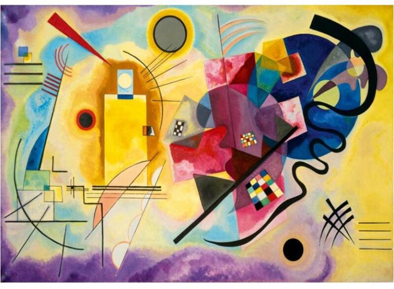 Az 1000 db-os Bluebird Art by puzzle képén Vassily Kandinsky által festett Sárga-piros-kék című 1925-ben alkotott festményét láthatjuk.