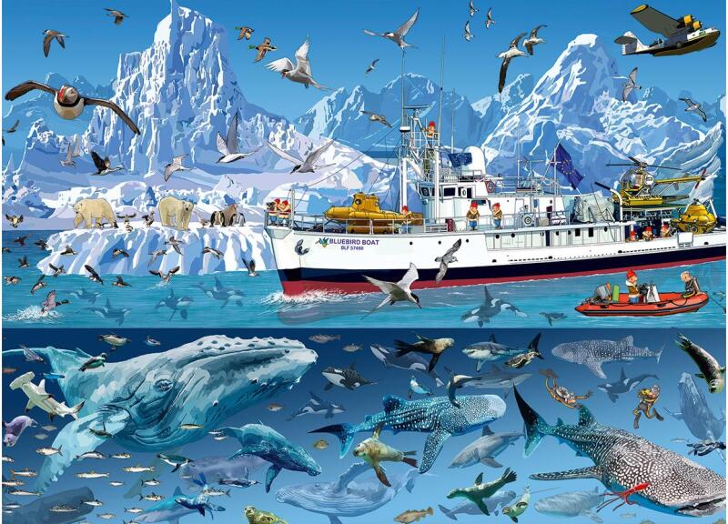 Az 1500 db-os Bluebird - Francois Ruyer - Arctic - Bluebird Boat puzzle  képén a francia illusztrátor ábrázolásában jelenik meg az Északi-sark élővilága és egy nagy hajó.