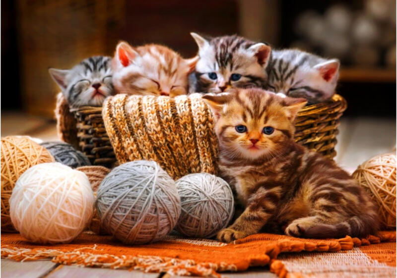 A Bluebird 1000 db-os puzzle - Kittens in Basket  című képen, aranyos kiscicák láthatóak.