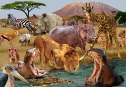 Bluebird 1000 db-os puzzle - Kilimanjaro  című kép hátterében a  Tanzániában található vulkán (a Kilimandzsáró ) látható, melynek fő csúcsa - az Uhuru - Afrika legmagasabb hegycsúcs a. A hegy előtti elterülő szavannán , az itatónál gyűlnek össze a terület jellegzetes vadállat ai.
