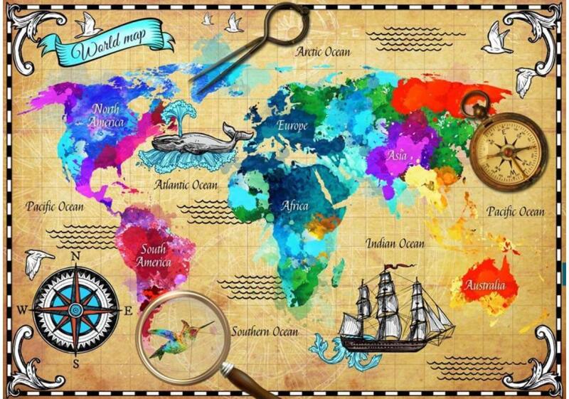 Színes és művészi világtérkép kel életre a Bluebird 90506 - Colorful World Map - 2000 db-os puzzle képén. A kirakó inspirál és utazásra hív a képzelet birodalmában.