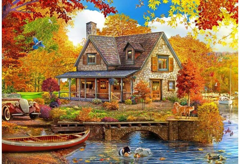 A francia  Bluebird  2019 óta van jelen a kirakók világpiacán. Magas minőségű, környezettudatos technológiával készült, mégis megfizethető áron elérhető puzzle képei közt elsősorban művészi alkotások találhatók. Az 1000 db-os Bluebird puzzle - Lake House  című képén egy hangulatos tóparti nyaraló látható, gyönyörű őszi táj madarakkal és a tóban játszadozó kutyákkal.