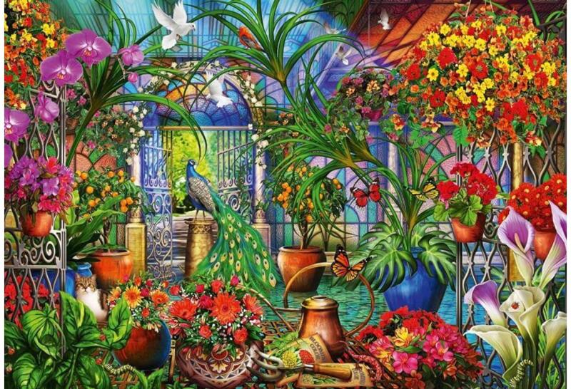 A francia  Bluebird  2019 óta van jelen a kirakók világpiacán. Magas minőségű, környezettudatos technológiával készült, mégis megfizethető áron elérhető puzzle képei közt elsősorban művészi alkotások találhatók. Az 1000 db-os Bluebird puzzle - Tropical Green House  című képén igazi trópusi hangulat vesz körül. Középen egy páva pózol, körös körül egzotikus növények pompáznak, pillangók és galambok repdesnek, és még egy cica is elbújt ebben a különleges üvegházban.