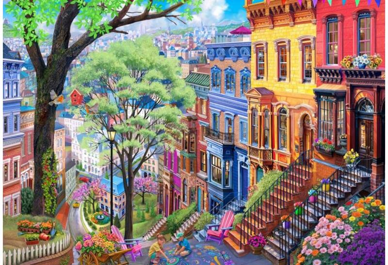 A madarak csicseregnek és az egész város virágbaborult: itt a tavasz! A Bluebird 1000 db-os puzzle - Spring Hill (90924)  kirakó képén egy hangulatos utcaképet látunk, színes épületekkel, virágokkal, gyerekekkel.