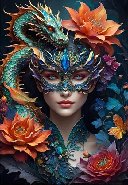 A Bluebird 1000 db-os puzzle - Lady with a Dragon (90926)  kirakó képén egy szépséges nőt látunk díszes álarcban, vállán a sárkányával, csodás virágokkal körülvéve.