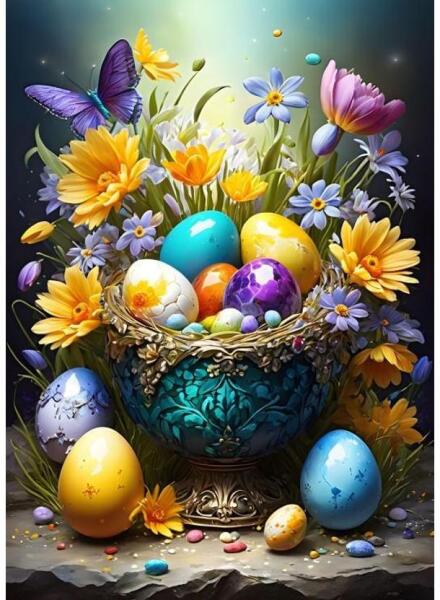 Tavaszi virágok között színes húsvéti tojások ragyognak. A Bluebird 90956 - Easter Eggs and Flowers - 500 db-os puzzle képe a megújulás és öröm üzenetét hordozza.