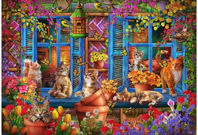 Virágok, madarak, pillangók... mi kell még? Hát cicák! Sok-sok játékos cica elevenedik meg a Bluebird 1000 db-os puzzle - Window Shelf Cats (90973)  kirakó kedves hangulatú képén.