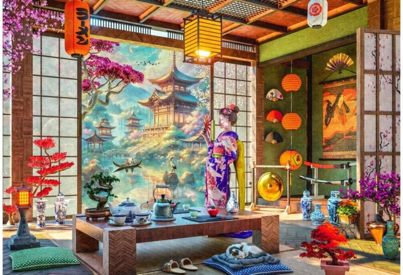 Egy tradicionális japán teaszoba nyugodt hangulatot árasztó fényekkel és finom részletekkel. A Bluebird 91018 - Japan Tea Room - 1000 db-os puzzle  képe a keleti kultúra békéjét idézi.