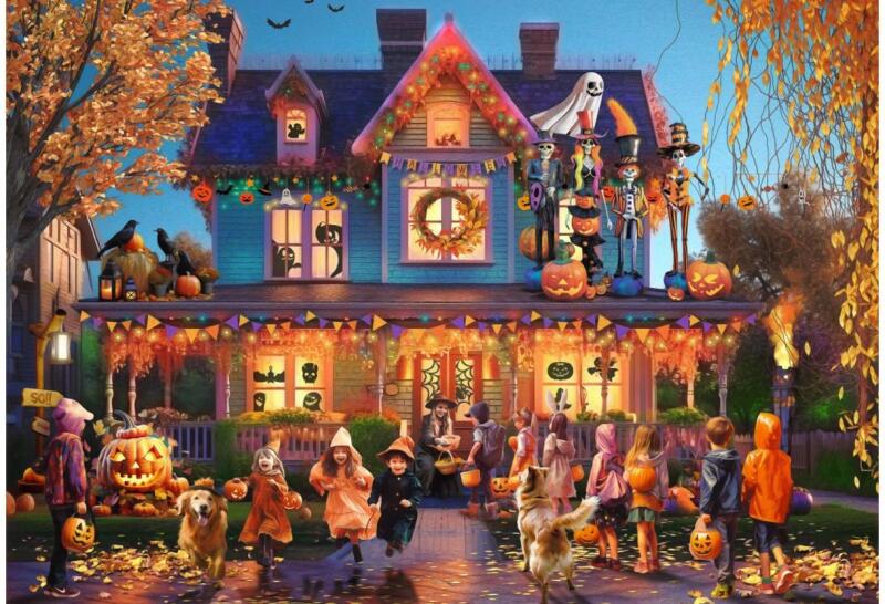 Boszorkányok, csontvázak és töklámpások teremtenek hátborzongatóan vidám hangulatot a Bluebird 91061 - Halloween - 1000 db-os puzzle  képén. Tökéletes választás az őszi ünnepre!