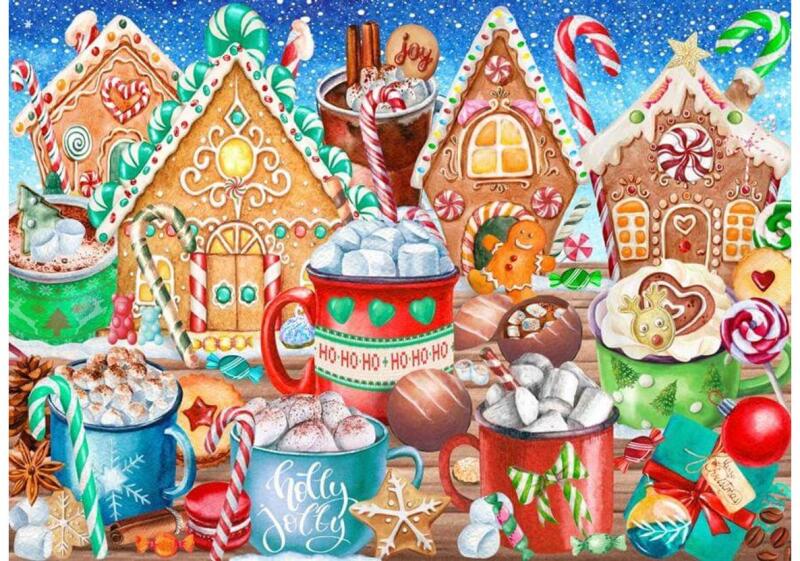 Forró kakaó és pillecukor és mézeskalács idézik meg az ünnepi ízeket. A Bluebird 91077 - Candy Canes And Cocoa - 500 db-os puzzle képe édes nosztalgiát és meghittséget sugároz.