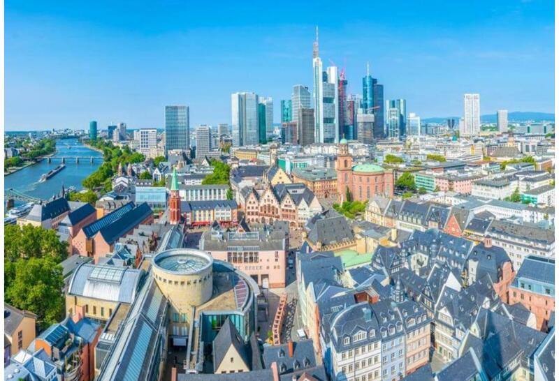 Frankfurt modern városképe madártávlatból tárul elénk a Bluebird 91105 - Aerial view of Frankfurt, Germany - 1000 db-os puzzle képén. A kirakó a városi élet nyüzsgését és dinamizmusát tükrözi.