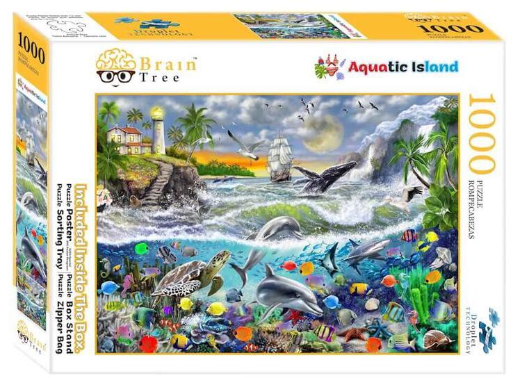 A Brain Tree a világ egyik vezető puzzle gyártója, amely kiváló minőségű kirakóival vált ismertté. Minden puzzle darabot egyedi, véletlenszerű vágás sal készítenek, amely különlegessé teszi azokat. A kirakó darabok 1,75 mm-es vastagságuk miatt rendkívül tartósak és masszív ak. A Droplet technológiá nak köszönhetően a kirakó felülete tükröződésmentes , ami még élvezetesebbé teszi az összerakást. A puzzle doboza több kiegészítőt is tartalmaz: poszter , cipzáras, visszazárható táska , 4 db kirakó válogató doboz a rendszerezéshez és egy doboztartó , amely stabilan tartja a puzzle dobozát, kirakózás közben. A  Brain Tree 1000 db-os puzzle - Aquatic Island (2102043) kirakó képén egy csodás tengeri élővilág látható.