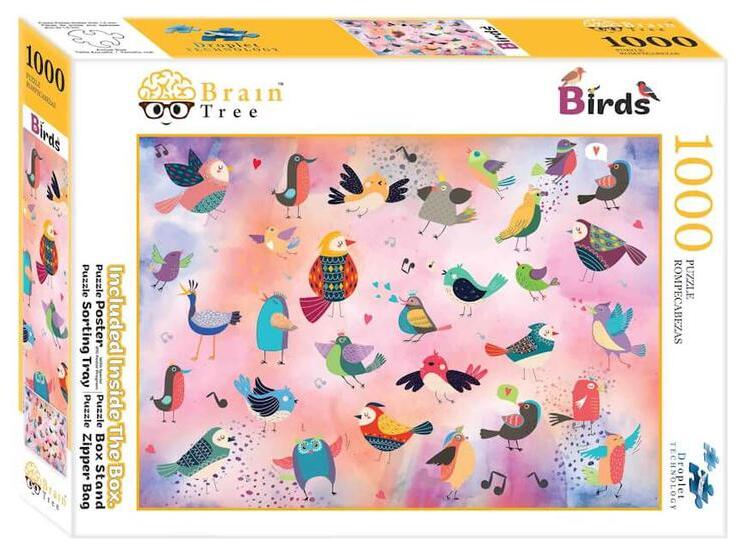 A Brain Tree a világ egyik vezető puzzle gyártója, amely kiváló minőségű kirakóival vált ismertté. Minden puzzle darabot egyedi, véletlenszerű vágás sal készítenek, amely különlegessé teszi azokat. A kirakó darabok 1,75 mm-es vastagságuk miatt rendkívül tartósak és masszív ak. A Droplet technológiá nak köszönhetően a kirakó felülete tükröződésmentes , ami még élvezetesebbé teszi az összerakást. A puzzle doboza több kiegészítőt is tartalmaz: poszter , cipzáras, visszazárható táska , 4 db kirakó válogató doboz a rendszerezéshez és egy doboztartó , amely stabilan tartja a puzzle dobozát, kirakózás közben. A  Brain Tree 1000 db-os puzzle - Birds (2102051) kirakó képén színes kismadarak láthatóak.