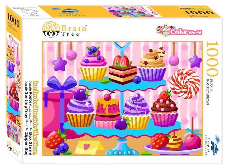 A Brain Tree a világ egyik vezető puzzle gyártója, amely kiváló minőségű kirakóival vált ismertté. Minden puzzle darabot egyedi, véletlenszerű vágás sal készítenek, amely különlegessé teszi azokat. A kirakó darabok 1,75 mm-es vastagságuk miatt rendkívül tartósak és masszív ak. A Droplet technológiá nak köszönhetően a kirakó felülete tükröződésmentes , ami még élvezetesebbé teszi az összerakást. A puzzle doboza több kiegészítőt is tartalmaz: poszter , cipzáras, visszazárható táska , 4 db kirakó válogató doboz a rendszerezéshez és egy doboztartó , amely stabilan tartja a puzzle dobozát, kirakózás közben. A  Brain Tree 1000 db-os puzzle - Cake World (2102052) kirakó képén ellenállhatatlanul színes sütemények láthatóak.