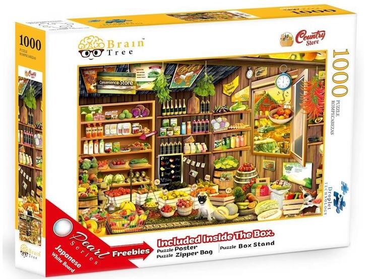A Brain Tree a világ egyik vezető puzzle gyártója, amely kiváló minőségű kirakóival vált ismertté. Minden puzzle darabot egyedi, véletlenszerű vágás sal készítenek, amely különlegessé teszi azokat. A kirakó darabok 1,75 mm-es vastagságuk miatt rendkívül tartósak és masszív ak. A Droplet technológiá nak köszönhetően a kirakó felülete tükröződésmentes , ami még élvezetesebbé teszi az összerakást. A puzzle doboza több kiegészítőt is tartalmaz: poszter , cipzáras, visszazárható táska , 4 db kirakó válogató doboz a rendszerezéshez és egy doboztartó , amely stabilan tartja a puzzle dobozát, kirakózás közben. A  Brain Tree 1000 db-os puzzle - Country store (2102141) kirakó képén egy csodálatos bolt látható, sok sok finomsággal.