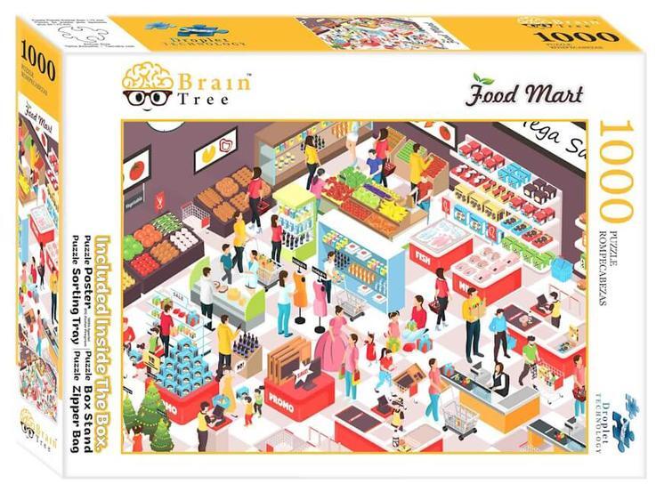 A Brain Tree a világ egyik vezető puzzle gyártója, amely kiváló minőségű kirakóival vált ismertté. Minden puzzle darabot egyedi, véletlenszerű vágás sal készítenek, amely különlegessé teszi azokat. A kirakó darabok 1,75 mm-es vastagságuk miatt rendkívül tartósak és masszív ak. A Droplet technológiá nak köszönhetően a kirakó felülete tükröződésmentes , ami még élvezetesebbé teszi az összerakást. A puzzle doboza több kiegészítőt is tartalmaz: poszter , cipzáras, visszazárható táska , 4 db kirakó válogató doboz a rendszerezéshez és egy doboztartó , amely stabilan tartja a puzzle dobozát, kirakózás közben. A  Brain Tree 1000 db-os puzzle - Food Mart (2102105) kirakó képén egy bevásárlóközpont látható.