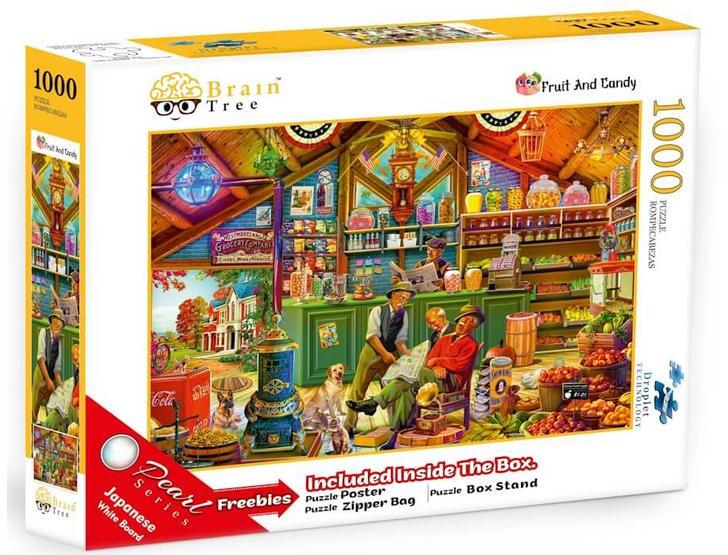 A Brain Tree a világ egyik vezető puzzle gyártója, amely kiváló minőségű kirakóival vált ismertté. Minden puzzle darabot egyedi, véletlenszerű vágás sal készítenek, amely különlegessé teszi azokat. A kirakó darabok 1,75 mm-es vastagságuk miatt rendkívül tartósak és masszív ak. A Droplet technológiá nak köszönhetően a kirakó felülete tükröződésmentes , ami még élvezetesebbé teszi az összerakást. A puzzle doboza több kiegészítőt is tartalmaz: poszter , cipzáras, visszazárható táska , 4 db kirakó válogató doboz a rendszerezéshez és egy doboztartó , amely stabilan tartja a puzzle dobozát, kirakózás közben. A  Brain Tree 1000 db-os puzzle - Fruit And Candy (2102129) kirakó képén egy cukorkabolt és gyümölcsös látható.