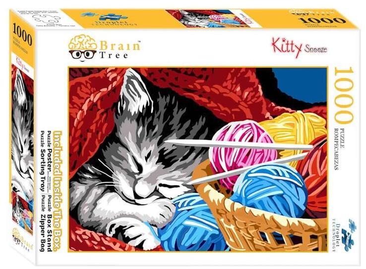 A Brain Tree a világ egyik vezető puzzle gyártója, amely kiváló minőségű kirakóival vált ismertté. Minden puzzle darabot egyedi, véletlenszerű vágás sal készítenek, amely különlegessé teszi azokat. A kirakó darabok 1,75 mm-es vastagságuk miatt rendkívül tartósak és masszív ak. A Droplet technológiá nak köszönhetően a kirakó felülete tükröződésmentes , ami még élvezetesebbé teszi az összerakást. A puzzle doboza több kiegészítőt is tartalmaz: poszter , cipzáras, visszazárható táska , 4 db kirakó válogató doboz a rendszerezéshez és egy doboztartó , amely stabilan tartja a puzzle dobozát, kirakózás közben. A  Brain Tree 1000 db-os puzzle - Kitty Snooze (2102057) kirakó képén egy cuki cica látható.