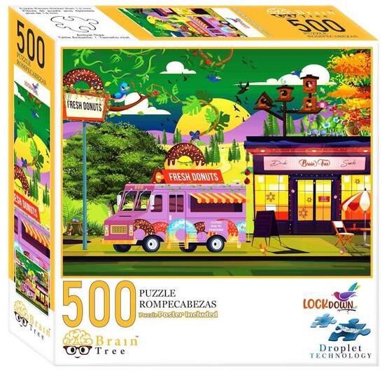 A Brain Tree a világ egyik vezető puzzle gyártója, amely kiváló minőségű kirakóival vált ismertté. Minden puzzle darabot egyedi, véletlenszerű vágás sal készítenek, amely különlegessé teszi azokat. A kirakó darabok 1,75 mm-es vastagságuk miatt rendkívül tartósak és masszív ak. A Droplet technológiá nak köszönhetően a kirakó felülete tükröződésmentes , ami még élvezetesebbé teszi az összerakást. A puzzle doboza több kiegészítőt is tartalmaz: poszter , cipzáras, visszazárható táska , 4 db kirakó válogató doboz a rendszerezéshez és egy doboztartó , amely stabilan tartja a puzzle dobozát, kirakózás közben. A  Brain Tree 500 db-os puzzle - Lockdown (2202007) kirakó képén egy aranyos édességbolt látható.