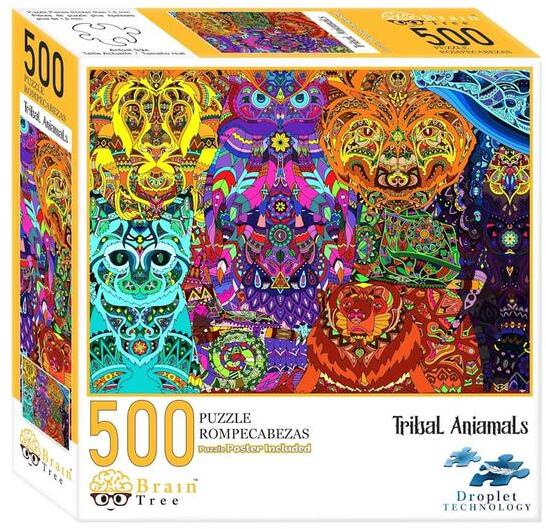 A Brain Tree a világ egyik vezető puzzle gyártója, amely kiváló minőségű kirakóival vált ismertté. Minden puzzle darabot egyedi, véletlenszerű vágás sal készítenek, amely különlegessé teszi azokat. A kirakó darabok 1,75 mm-es vastagságuk miatt rendkívül tartósak és masszív ak. A Droplet technológiá nak köszönhetően a kirakó felülete tükröződésmentes , ami még élvezetesebbé teszi az összerakást. A puzzle doboza több kiegészítőt is tartalmaz: poszter , cipzáras, visszazárható táska , 4 db kirakó válogató doboz a rendszerezéshez és egy doboztartó , amely stabilan tartja a puzzle dobozát, kirakózás közben. A  Brain Tree 500 db-os puzzle - Tribal Animals (2202010) kirakó képén egy bonyolult illusztráció látható a törzsi állatokról.