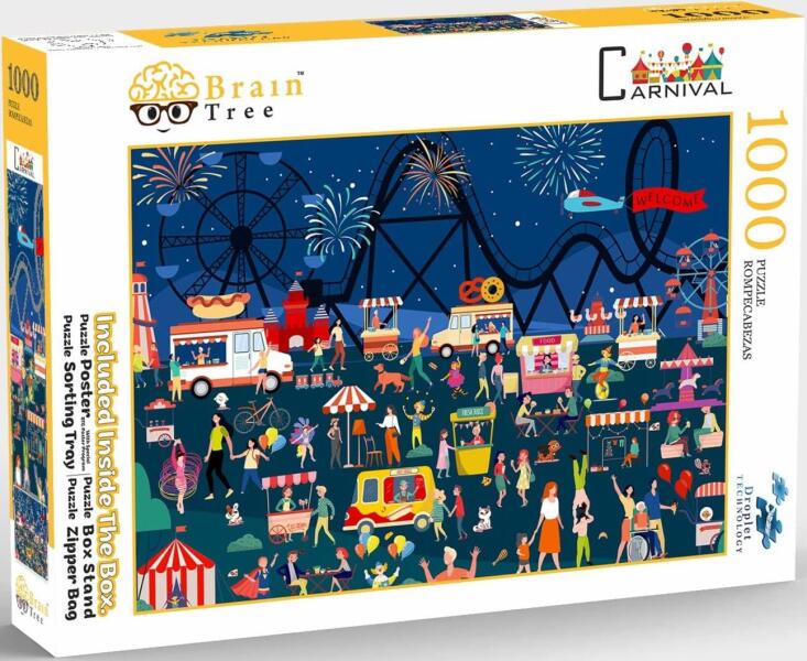 A Brain Tree a világ egyik vezető puzzle gyártója, amely kiváló minőségű kirakóival vált ismertté. Minden puzzle darabot egyedi, véletlenszerű vágás sal készítenek, amely különlegessé teszi azokat. A kirakó darabok 1,75 mm-es vastagságuk miatt rendkívül tartósak és masszív ak. A Droplet technológiá nak köszönhetően a kirakó felülete tükröződésmentes , ami még élvezetesebbé teszi az összerakást. A puzzle doboza több kiegészítőt is tartalmaz: poszter , cipzáras, visszazárható táska , 4 db kirakó válogató doboz a rendszerezéshez és egy doboztartó , amely stabilan tartja a puzzle dobozát, kirakózás közben. A  Brain Tree 1000 db-os puzzle - Carnival (2101023) kirakó képén egy fesztivál látható.